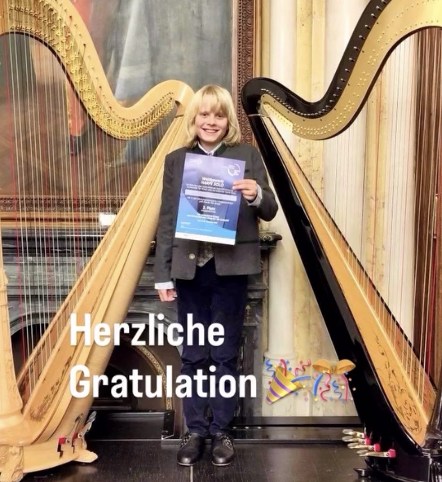 Cle­mens Geue­nich (Unter­richt bei Regi­na Kätzl­mei­er) hat am 26.09.25 erfolg­reich am inter­na­tio­na­len Har­fen­wett­be­werb „Arpa GRA­Zio­sa“ in Graz teil­ge­nom­men. Er hat den 3. Platz in sei­ner Alters­grup­pe erhal­ten. Herz­li­che Gra­tu­la­ti­on dem glück­li­chen Har­fe­nis­ten.